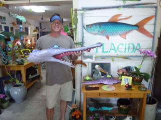 The little re-purposed shop, has many fans both in and out of town, wanting much of the crafted items in the shop, for decorating the walls of their high end condo’s and homes. Many of Jon’s and his father’s creations are shipped all over the USA. Who wouldn’t enjoy viewing, what most people would think of as flotsam and jetsam, seeing that same discarded and passed-by-as-junk, become a true piece of cherished art, such as a palm branch turned into a gorgeously crafted croc or alligator that doesn’t bite! Well, at Hatch Gallery you’ll see this and true collectible land and sea antiques as well! Check out their website: www.john-hatch-originals.com and give the Hatch Family a call at: (941)-697-9531