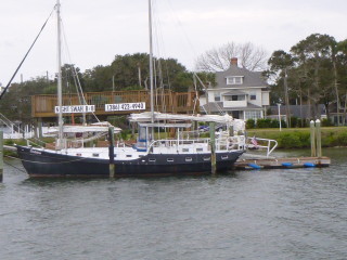Water to land view of the Night Swan B&B with the sailing charter double mast schooner on their end dock!