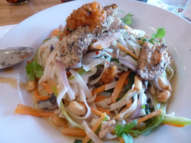 Barb and I enjoyed a nice and tasty dinner in this pub. We ordered the garlic chicken wings, lots of them. They were amongst the best we have ever ordered. The wings came with their home-made bleu cheese, carrots and their special house sauce. Very crispy, and not greasy. After looking over the menu for their main course, we decided on their fish n’ chips. The fish was coated in EBC Two Brother”s Pale Ale beet battet and Japanese bread crumbs, then deep fried. The dish came with crispy fries and Coleslaw. We had Pad Thai noodle and chicken dish. It had light spice with al dente’ noodles. The noodles were covered with broiled chicken strips. It was the special of the night. The locals commented that they have a terrific burger. They have dining on their patio. Since they are known for having over a selection of 20 local and hard to find craft beers. We sampled a few. That was a treat.