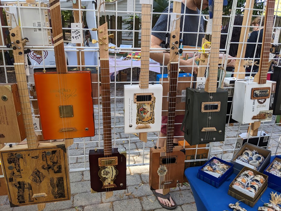 Dave loves making guitars out of boxes. especially cigar boxes. He explained that these boxes have the right wood for a good sound off the strings. Also they are often relegated to the junk pile. He saves them and the early graphics they are embossed with for posterity, and as repurposed for music.Some of the many guitars made of various boxes saved by Dale for repurposing to usable, fun music makers.