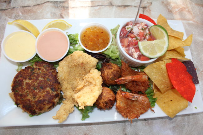 A platter that still brings salivation! Crab cake, coconut shrimp, cracked conch, ceviche of lobster and conch, conch fritters and mango sauces as well as other tropical dips.